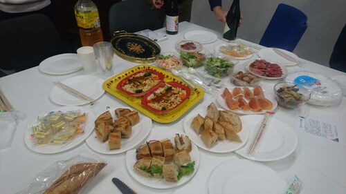 先日(11/18)「ボジョレヌーボをいただく会」が社内で催されました。 いただきもののボジョレー3本(HHMT社から1本、ITC社から1本、S氏から1本)追加ワイン2本 BigBeansのローストビーフとチーズとグラタン社員手作りの生ハム柿社長差入のPAULの堅いパン…