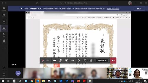 先日、入社20周年を迎えたIさんと、15周年を迎えたAさんの永年勤続表彰式をオンラインにて行いました。 本来であれば、従業員全員が集まるタイミングで、社長から表彰状の授与等を行うミニセレモニーを実施するのですが、今年はコロナの影響で、オンラインで…